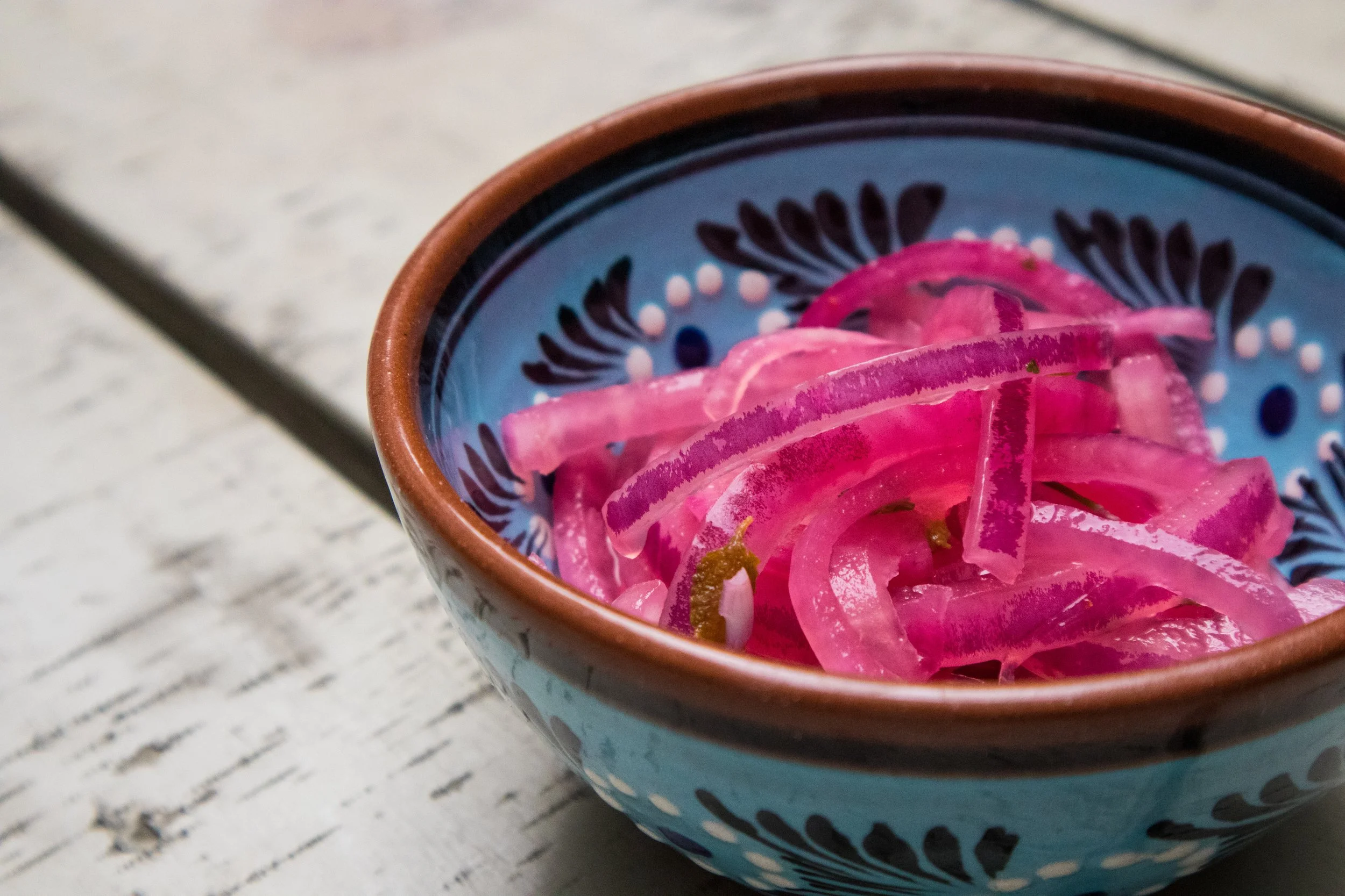 Blanch the onions in boiling water for 1 minute and then shock in ice water. In a serving bowl, add the drained onions, spices, salt and water to the bitter orange juice. If possible, set aside to pickle for two hours. Will keep for several weeks refrigerated.