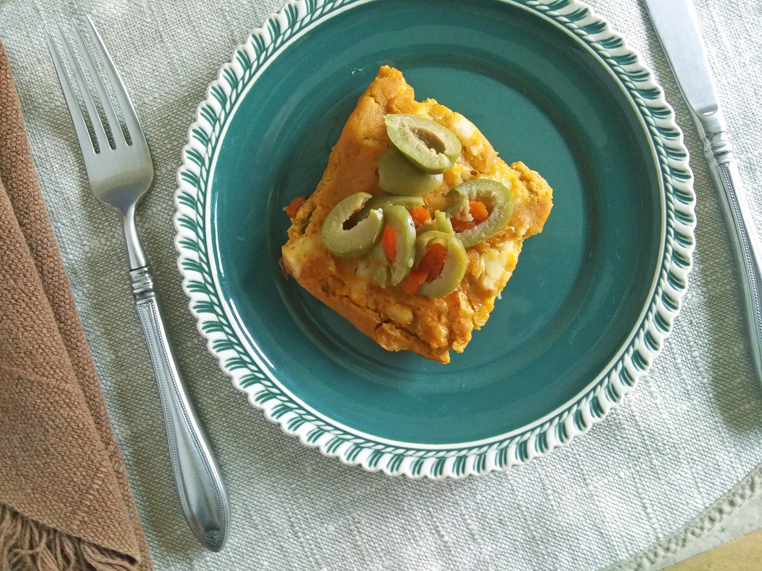 3. Put roasted veggies in the casserole's bottom, pour the custard over and smooth, poking the custard down into the veggies. Top with the cheese and olives. Cover and bake at 350 F for 30 minutes. Uncover, turn the heat up to 400F for another 15 minutes or until the custard is firm. Serve warm.